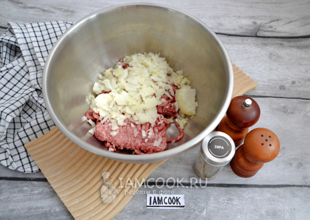 Пока тесто подходит, приготовьте начинку. Добавьте к фаршу мелко нарезанный лук, соль и черный молотый перец по вкусу, зиру. Прежде чем добавлять зиру, разотрите ее между ладоней, так она даст больше вкуса и аромата, перемешайте.