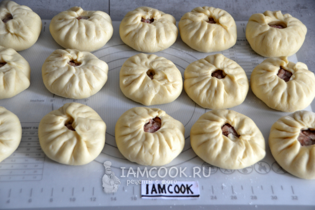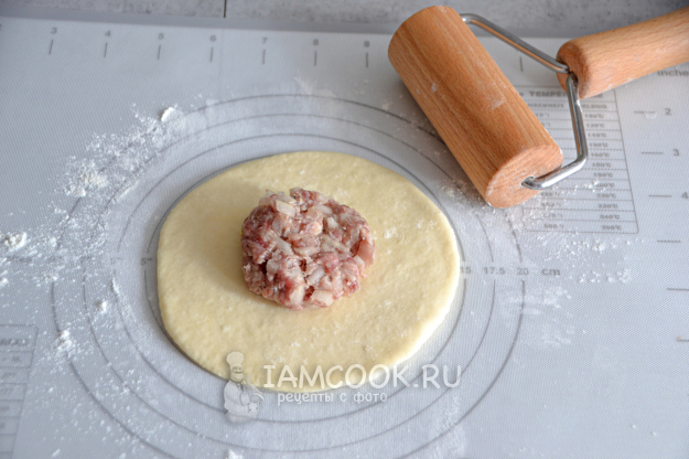 Через 30 минут приступайте к лепке кайнаров. Раскатайте тесто в тонкую лепешку, в центр положите фарш.