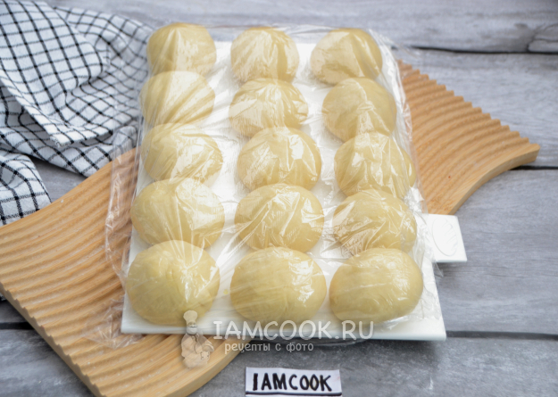 Разделите тесто на 15 равных частей, подкатайте каждую часть в шар, накройте пищевой пленкой, дайте расстояться 30 минут.
