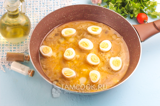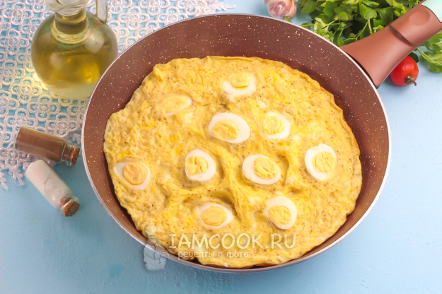 Прогрейте сковороду и влейте в нее растительное масло или растопите в ней сливочное. Влейте яичную массу. Разрежьте вареные перепелиные яйца пополам и выложите во взбитые яйца в хаотичном порядке.