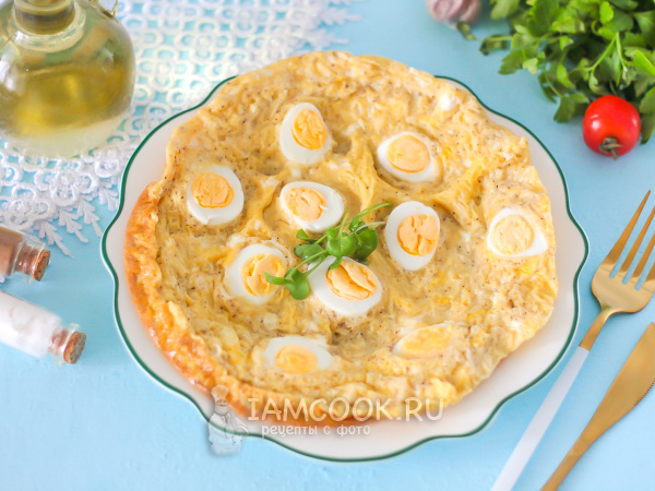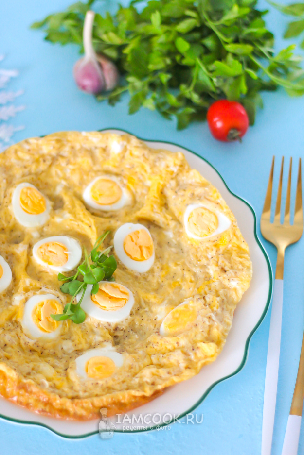 Выложите омлет с вареными перепелиными яйцами на тарелку и подайте к столу горячим, с соусом, салатом из овощей и т.д.