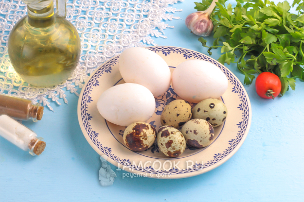Продукты для приготовления омлета с перепелиными яйцами (вареными) - перед вами!