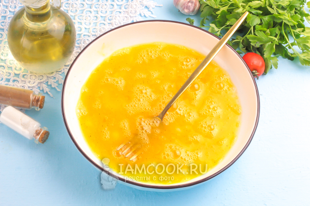 Вбейте куриные яйца в миску или салатник и всыпьте туда же соль, молотый черный перец. По желанию добавьте другие специи и приправы. Взбейте все вилкой либо венчиком в течение 2-3 минут.