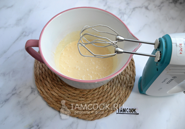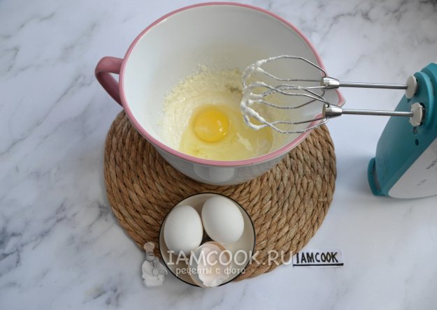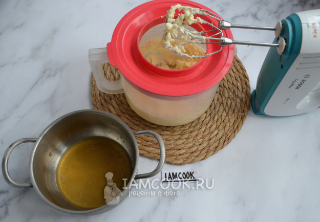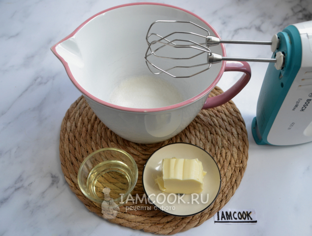 В чашу для смешивания всыпьте сахар, влейте растительное масло, добавьте сливочное масло, всё взбейте до пышности.