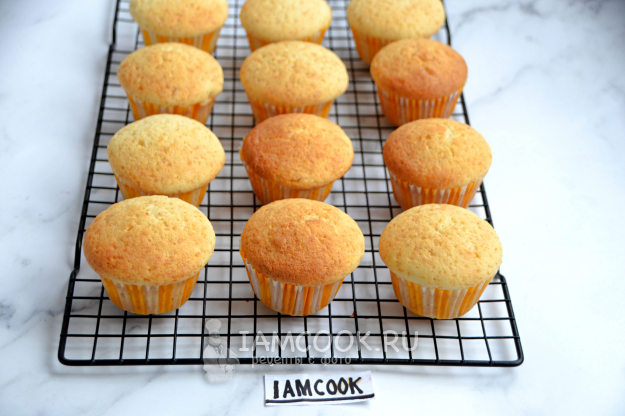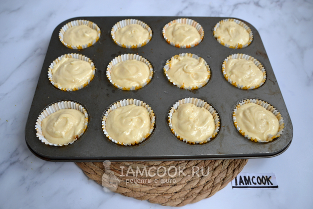 Вставьте бумажные капсулы в металлическую форму, выложите тесто на 12 капкейков. Разогрейте духовку в режиме "верх-низ" до 180 градусов, выпекайте до готовности, примерно 20-25 минут.