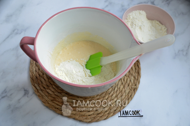 Смешайте муку и разрыхлитель. Если вы будете добавлять ванильный сахар, то добавьте его на этом этапе.