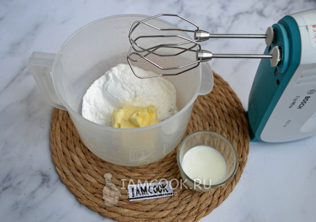 Взбейте мягкое сливочное масло, сахарную пудру, влейте молоко.