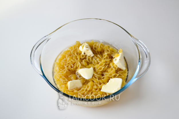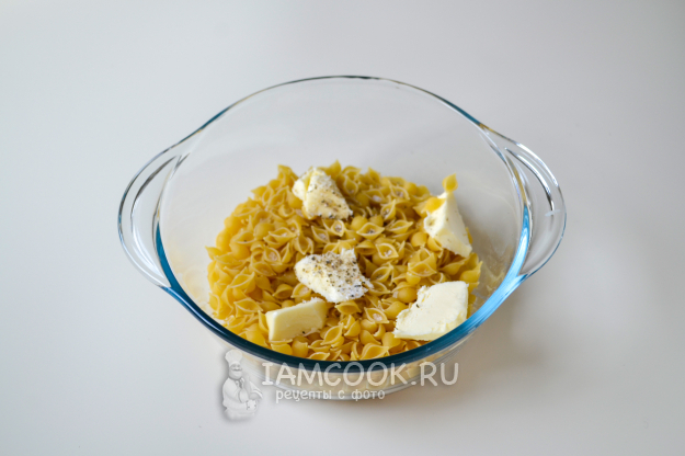 В подходящую для запекания в аэрогриле форму положите сухие макароны, сливочное масло, добавьте соль и перец черный молотый.