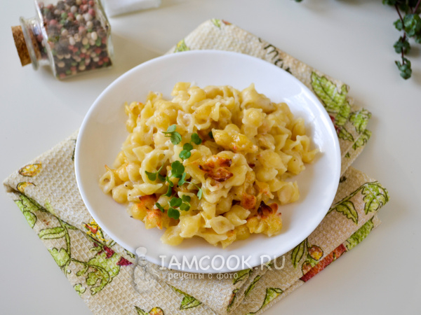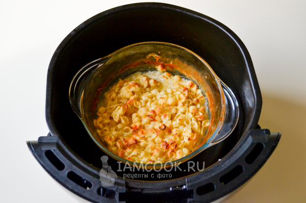 Макароны с сыром в аэрогриле были готовы примерно за 35 минут. Время приготовления будет зависеть от мощности прибора, сорта и размера макарон. Если не хотите верхнюю поджаристую корочку - прикройте форму фольгой. Попробуйте, и если макароны недостаточно мягкие, увеличьте время приготовления на 3-4 минуты.