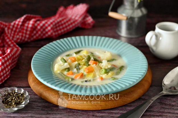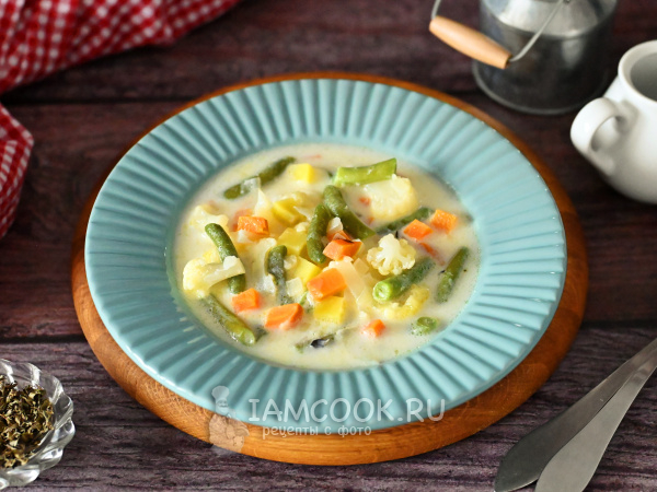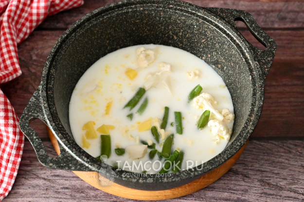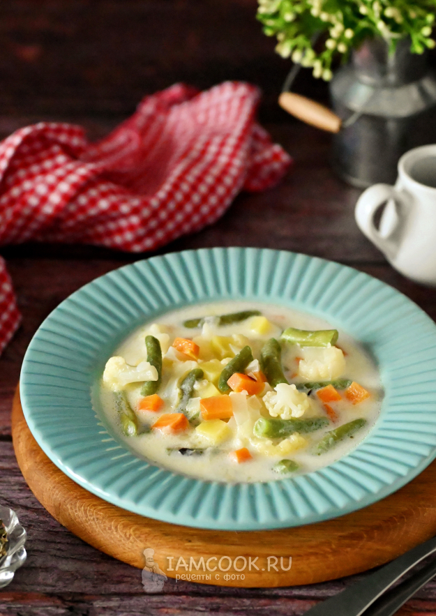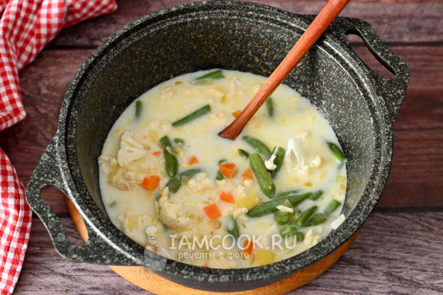 Набор овощей для этого супа можно периодически менять. На мой взгляд, ключевые овощи - лук и морковь - нужно оставить, а вот все остальные вполне подлежат замене. Цветная капуста легко заменяется на белокочанную или брокколи. Стручковая фасоль может быть заменена на кабачок/патиссон или даже замороженный горошек. А картофель можете заменить на тыкву или батат. Все эти овощи хорошо сочетаются с молочным вкусом супа.