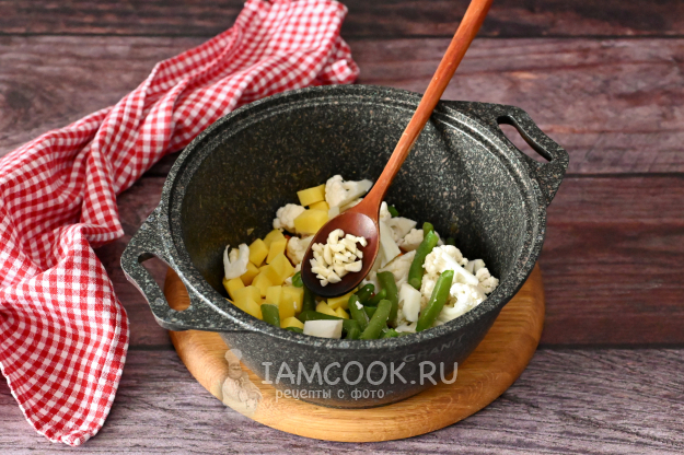 Как только лук с морковкой станут прозрачными, добавьте в кастрюлю нарезанные овощи (картофель, цветную капусту и стручковую фасоль). А также я добавляю для аромата нарезанный зубчик чеснока. В процессе варки в молоке чеснок потеряет остроту и резкий запах, но придаст супу дополнительный аромат. Если сомневаетесь насчёт чеснока - не добавляйте.