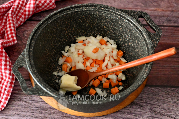 Первым делом отправьте в кастрюлю нарезанные лук и морковь и добавьте кусочек сливочного масла.