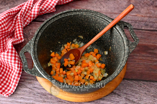 Потушите лук с морковкой в масле до прозрачности. Не поджаривайте, а именно слегка потомите, чтобы они стали мягкими и нежными. Вкус жареного лука в этом супе не нужен.