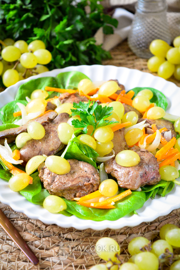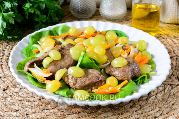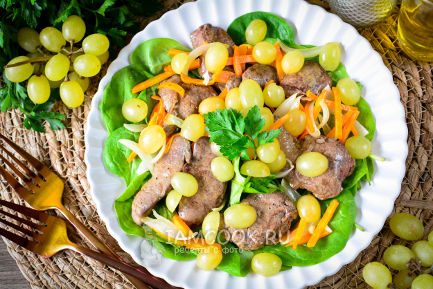 В теплом виде подавайте к столу. Салат с куриной печенью и виноградом - это вкусно, полезно и сытно!
