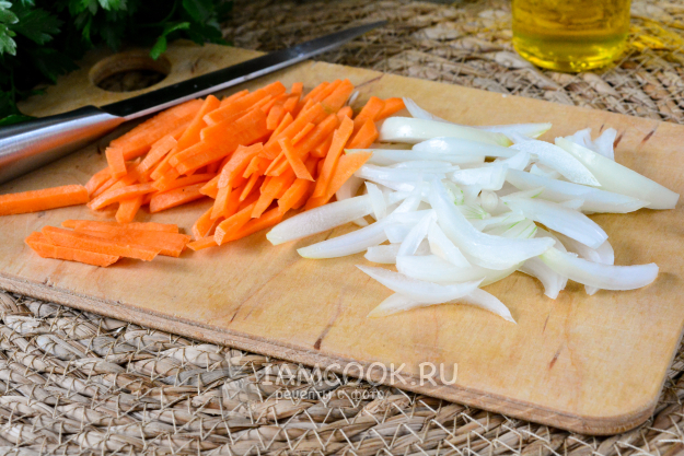 Лук и морковь почистите, сполосните. Морковь нарежьте соломкой, а небольшую луковицу - тонкими полукольцами.