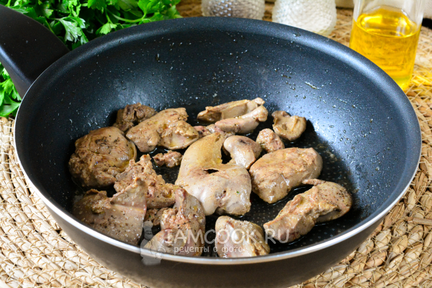Куриную печень промойте, удалите пленки, нарежьте средними кусочками. Печень также обжаривайте на сковороде с добавлением оливкового масла. Добавьте соль и черный перец по вкусу, жарьте 5-6 минут, помешивая.