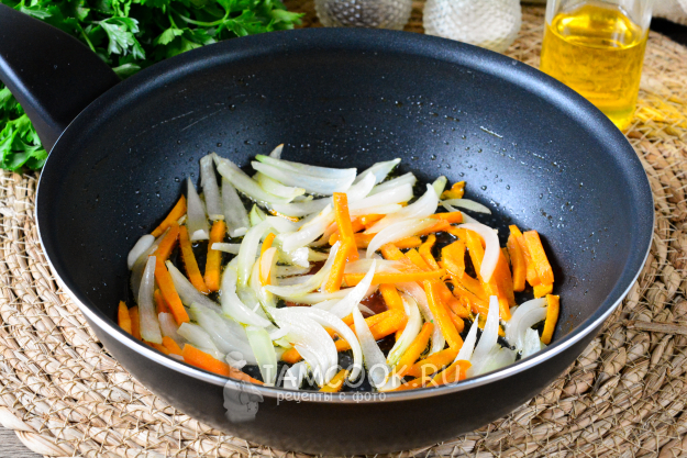 Смажьте сковороду оливковым маслом, разогрейте, выложите туда овощи и пассеруйте 3-4 минуты, до мягкости.