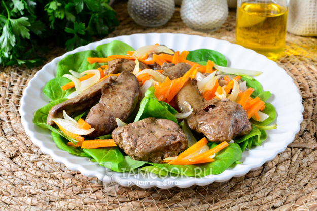 На сервировочное блюдо выложите подушку из зелени, у меня шпинат. Также можете использовать листья салата или айсберг. На подушку из зелени выложите теплые обжаренные овощи и куриную печень. Дополнительно поливать маслом салат не нужно, так как овощи и печень с ним обжаривались, этого количества будет достаточно, чтобы не переборщить с жиром.