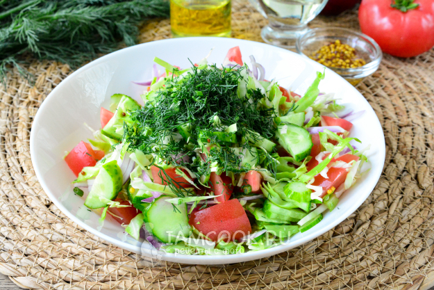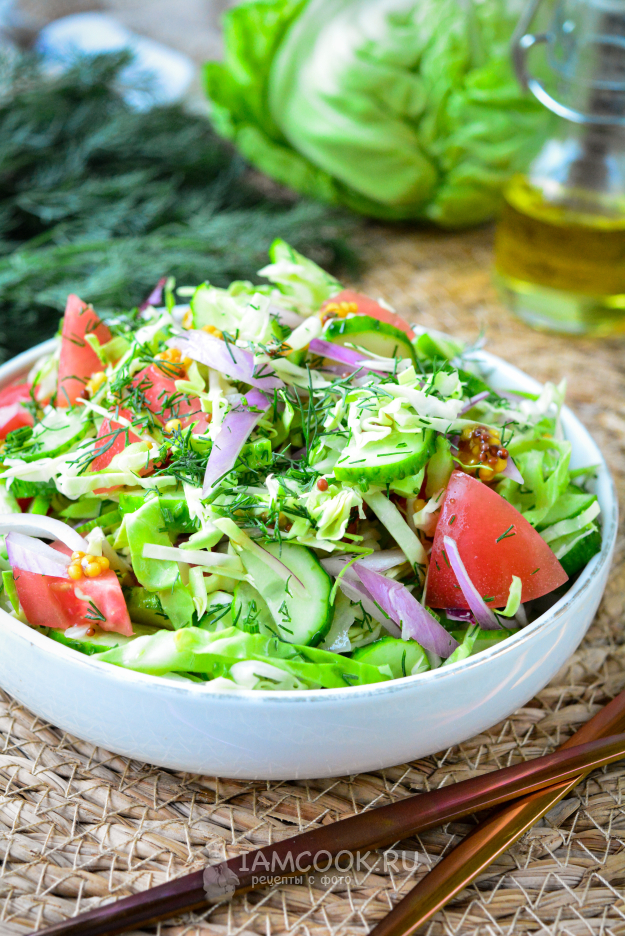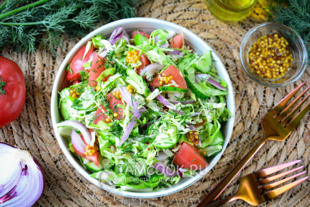 Сочный, вкусный и полезный летний салат из капусты подавайте к столу.