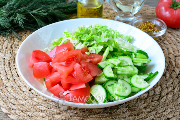 Нарезанную капусту выложите в салатник. Туда же выложите нарезанные помидоры и огурцы. Овощи предварительно нарежьте средними кусочками или полукружиями.