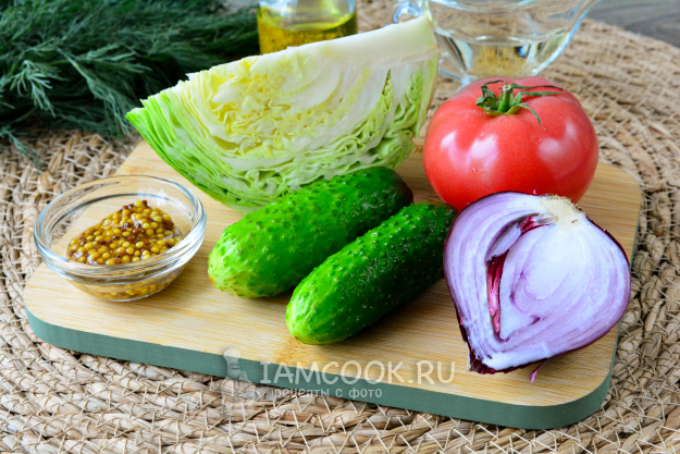 Соберите все необходимые продукты для приготовления летнего салата из капусты.
