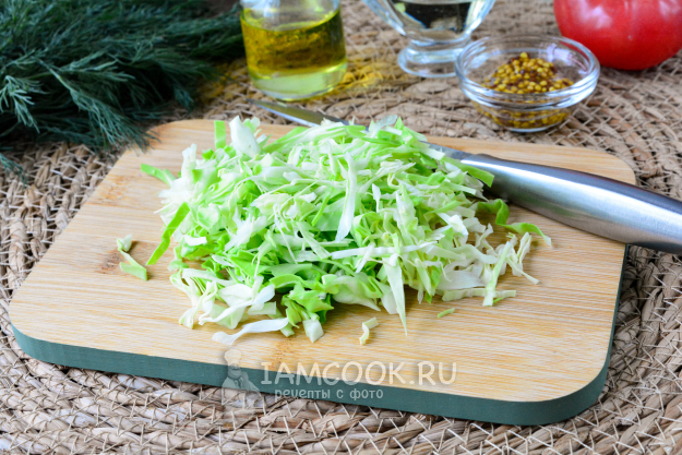 Молодую капусту сполосните и нашинкуйте тонкими длинными полосками.