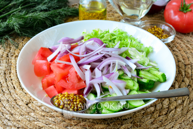 Нарезанный лук выложите к овощам, добавьте французскую горчицу. Салат полейте оливковым маслом, добавьте яблочный уксус и специи по вкусу. Перемешайте.