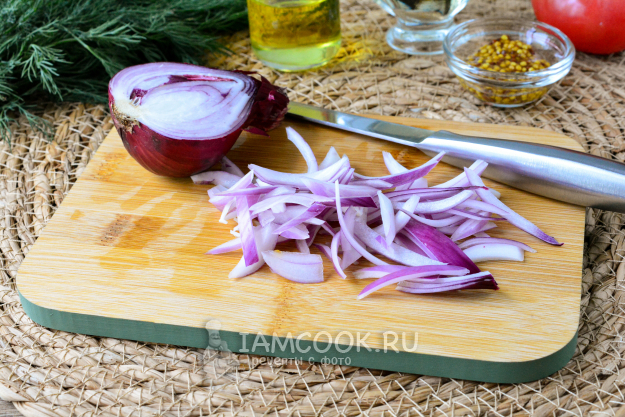 Почистите красный салатный лук, нарежьте его перьями - полукольцами.