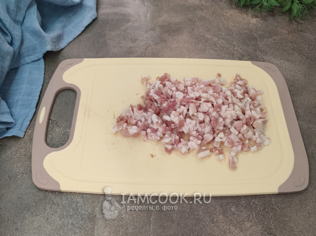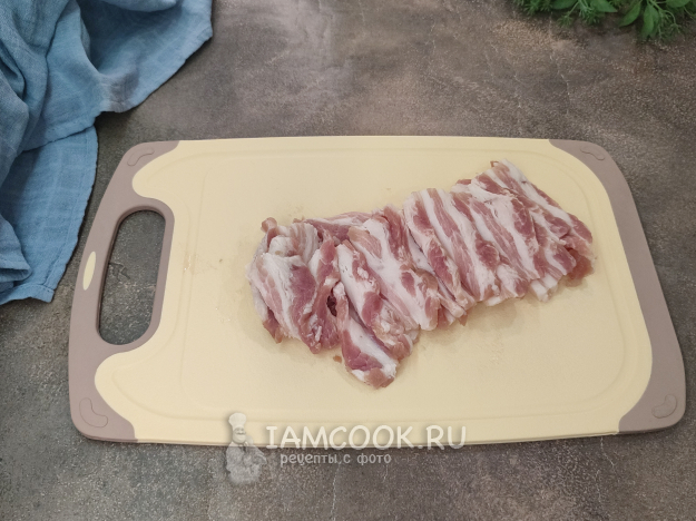 Поскольку блюдо готовится быстро, на сильном огне и при постоянном помешивании, сначала нужно все нарезать, подготовить. Грудинку нарежем сначала пластинками.