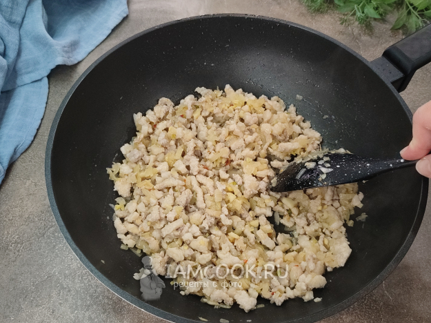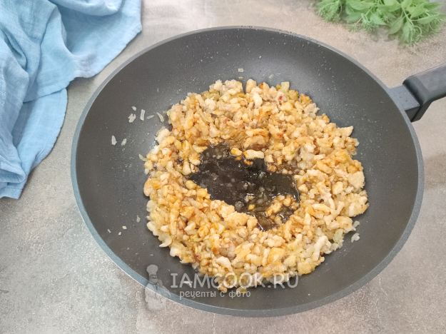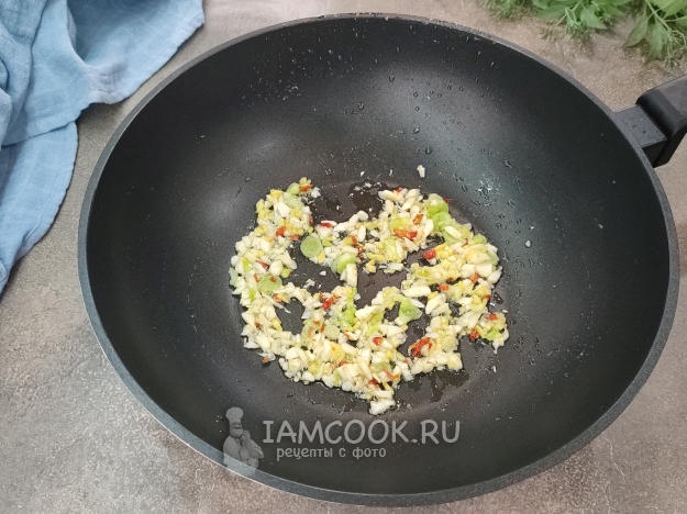 При необходимости добавьте в сковороду еще пару ложек растительного масла, отправьте в сковороду имбирь, чеснок, чили, белую часть зеленого лука, обжаривайте, постоянно помешивая, 20-30 секунд, затем добавьте репчатый лук. Обжаривайте до прозрачности.