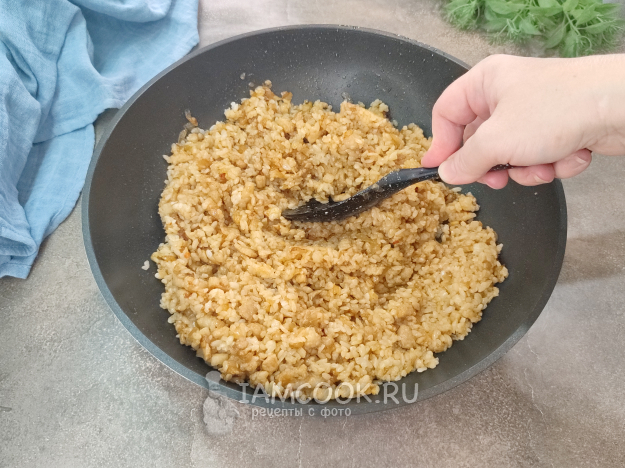Рис - комочками, и это нормально. Разминаю их обратной стороной лопатки и смешиваю с мясом.