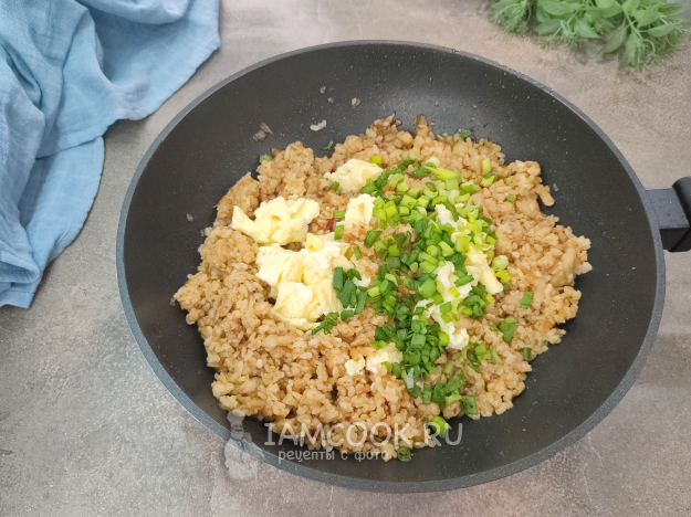 В самом конце возвращаем в сковороду яйца, кладем зеленый лук.