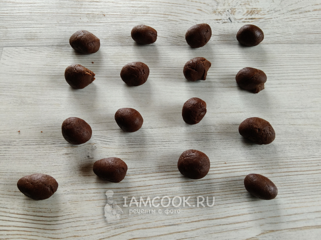 Тесто разделить на маленькие кусочки. Какого размера будут ваши кусочки, будет зависеть от размера "лунок", этот момент можно регулировать в процессе, чтобы было меньше излишков при выпекании.