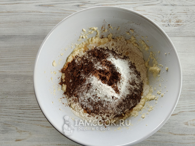 Добавить муку, какао и разрыхлитель.