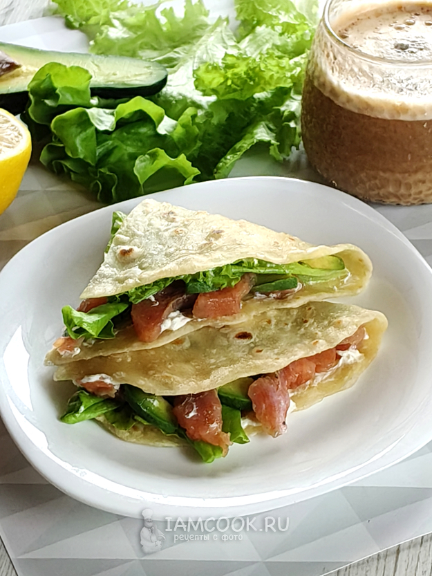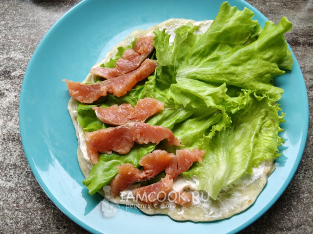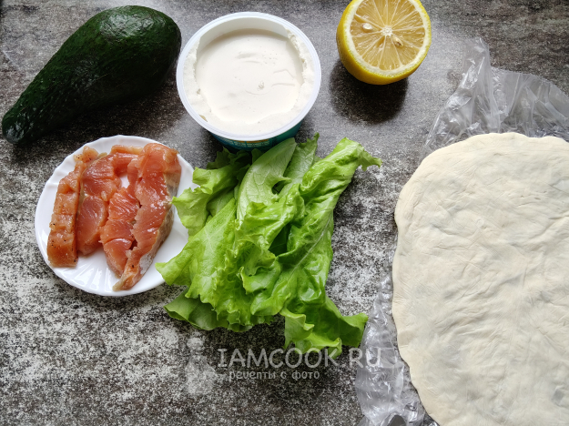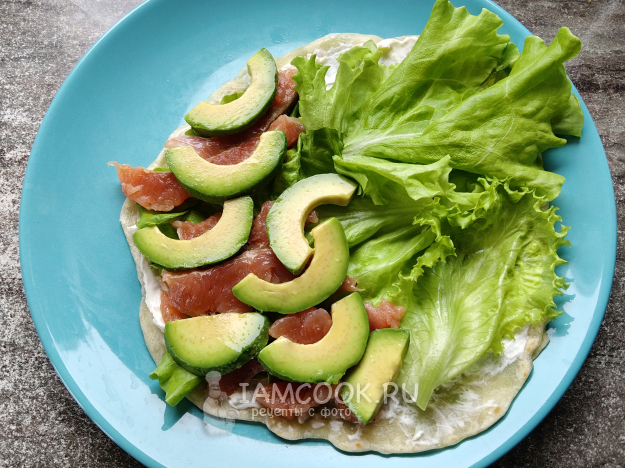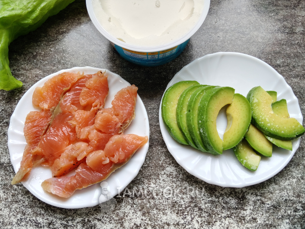 Красную рыбу и авокадо нарезать тонкими кусочками, сбрызнуть лимонным соком. Авокадо я подсолила.