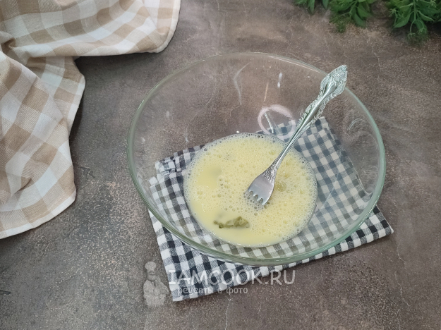 Сначала тесто. В миску выбейте яйцо, добавьте соль, воду.