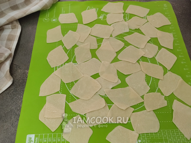 По-хорошему, тесто нужно бы раскатать в один большой пласт, потом нарезать его кубиками-ромбиками со стороной примерно 5-6 см. У меня тесто получилось очень тугим и мне не хватило силенок, чтобы раскатать этот пласт до нужной толщины 🤦♀️. Тогда я сначала нарезала маленькие ромбики-квадратики и потом уже каждый такой ромбик раскатывала. Времени, конечно, ушло больше, зато тесто получилось правильным, тонким, не липло к доске, скалке и друг к другу.