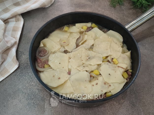 Зелень добавлять не обязательно, но мне нравится. Еще я слегка острым перчиком присыпала. Бульон процедите через ситечко и подайте отдельно, он, кстати, весьма неплох! Упругое, вкусное тесто, лук слегка хрустящий, каким он и должен быть в этом блюде, картошка и мясо... Оооочень вкусно, попробуйте!