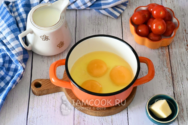 Соберите необходимые продукты для приготовления омлета с помидорами черри. Я надеюсь, все помнят, что перед приготовлением нужно тщательно вымыть яйца и помидорки черри.