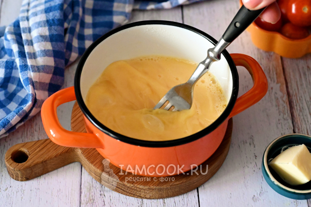 Снова смешайте всё вилкой, чтобы яйца и молоко соединились в единую массу.
