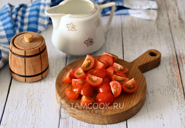 А тем временем нарежьте черри помидоры на четвертинки.