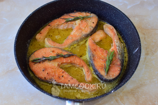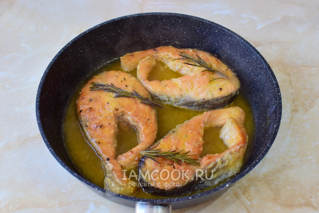 Добавьте по веточке розмарина. Накройте крышкой и потушите на небольшом огне минут 8-10. За счет того чтобы рыба была в муке, соус постепенно станет гуще. Этим же соусом полейте стейки сверху.
