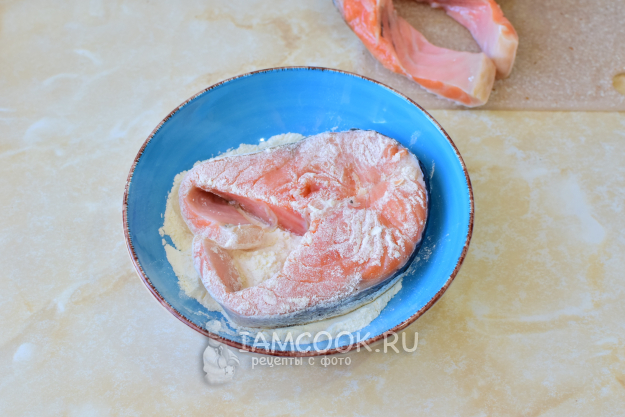 Рыбу нарежьте на стейки или на порционные кусочки. Обваляйте в муке.