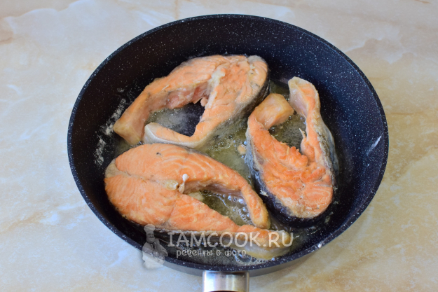 На горячую сковороду налейте растительное масло и выложите рыбу. Обжарьте её с двух сторон по 2-3 минуты, чтобы она начала слегка поджариваться.