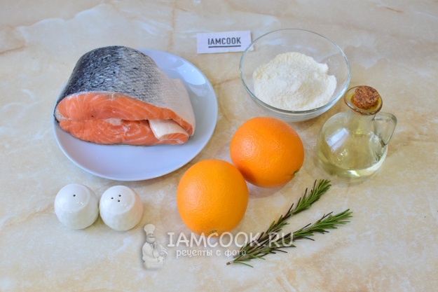 Чтобы приготовить лосося в апельсиновом соусе на сковороде, соберите необходимые ингредиенты по списку.