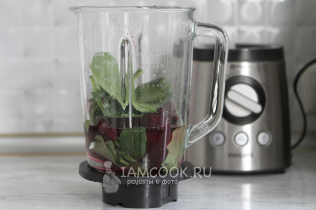 Свёклу нарежьте кусочками и переложите в чашу блендера вместе с листьями шпината. Влейте воду. Можно дистиллированную, родниковую или кипяченую, предварительно ее остудив.