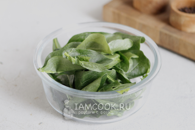 Листья шпината промойте под проточной водой и обсушите бумажным полотенцем. Удалите стебельки.