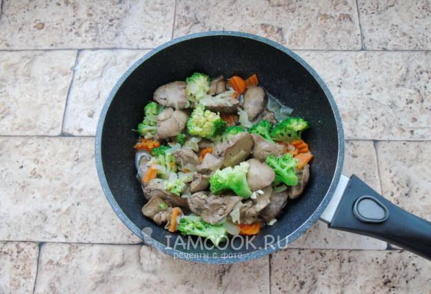 Налейте в сковороду куриный бульон или воду. Посолите и поперчите по вкусу. Накройте крышкой и прогрейте печень с брокколи, луком, морковью и чесноком 5-6 минут до готовности на небольшом нагреве.