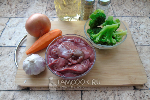 Соберите ингредиенты для приготовления куриной печени с брокколи на сковороде.