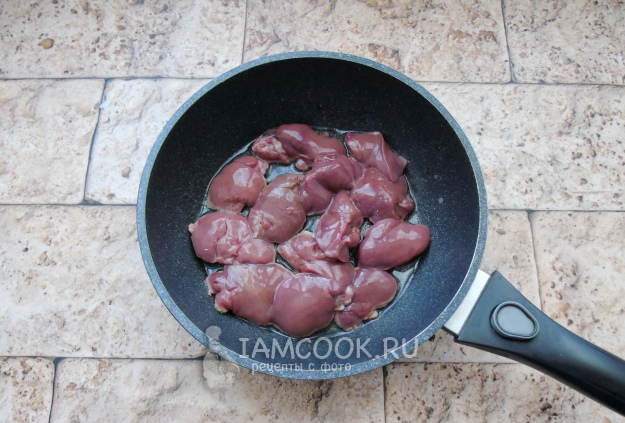 У куриной печени удалите пленки и прожилки. Разрежьте на две части, помойте. Дайте стечь воде и выложите на горячую сковороду с растительным маслом.